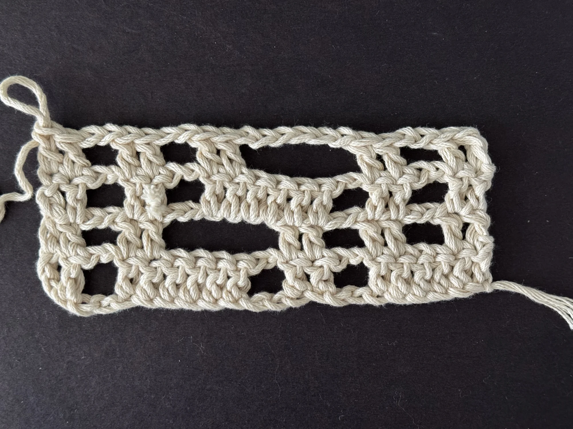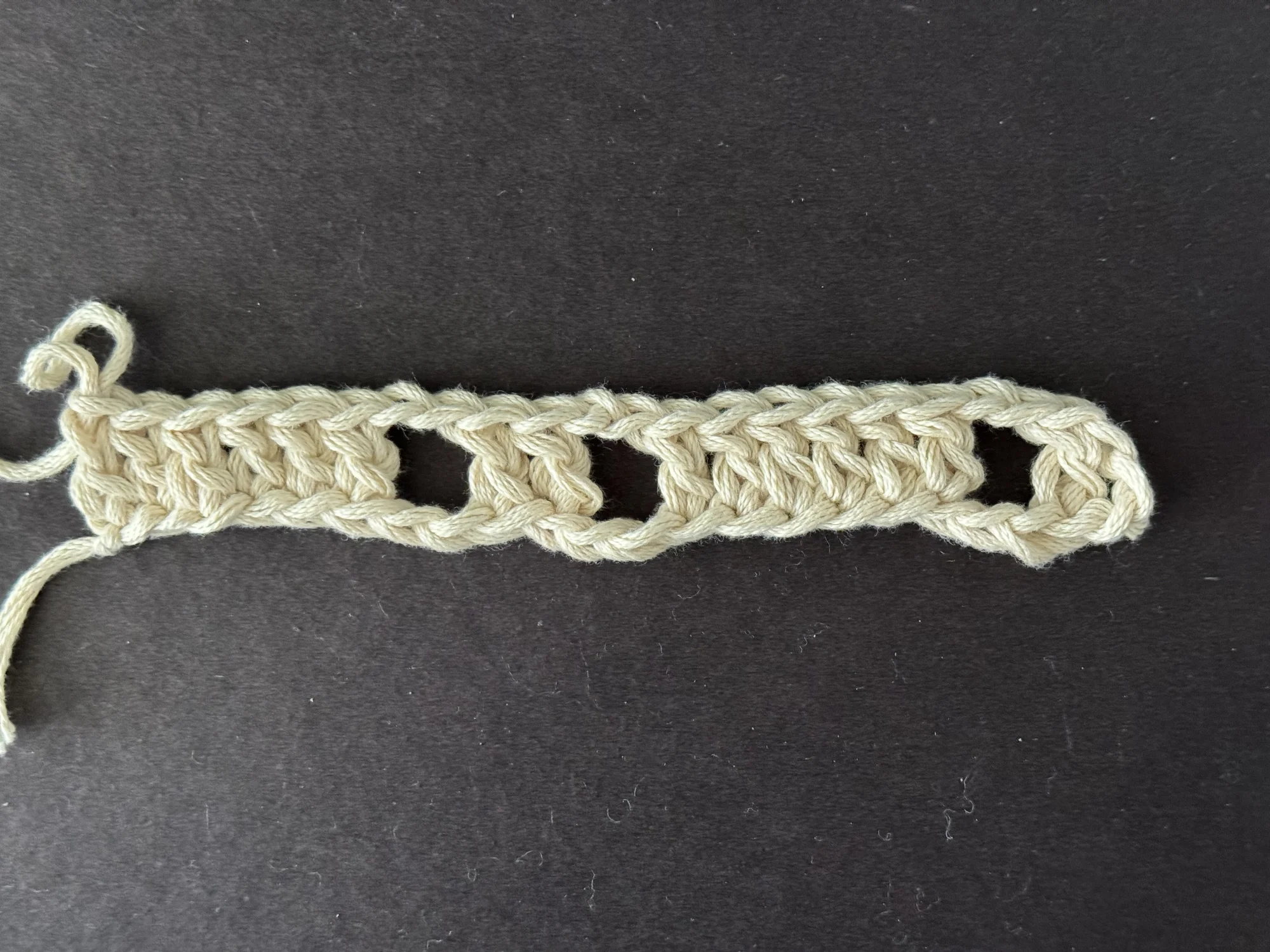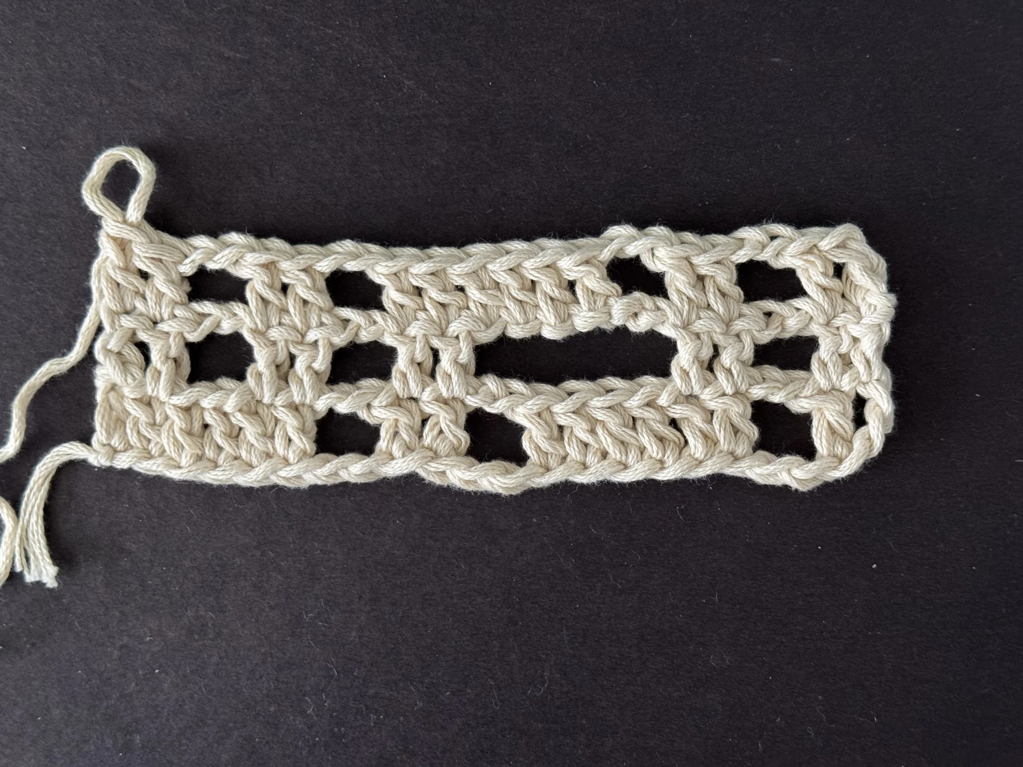 Row 4: CSDC in first st, dc in next st, ch 2, sk 2 sts, dc in next 2 sts, *ch 6, sk 6 st, dc in next 2 sts, ch 2, sk 2 sts, dc in next 2 sts, repeat from * until 4 sts remain, ch 2, sk 2 sts, dc in last 2 sts, turn.