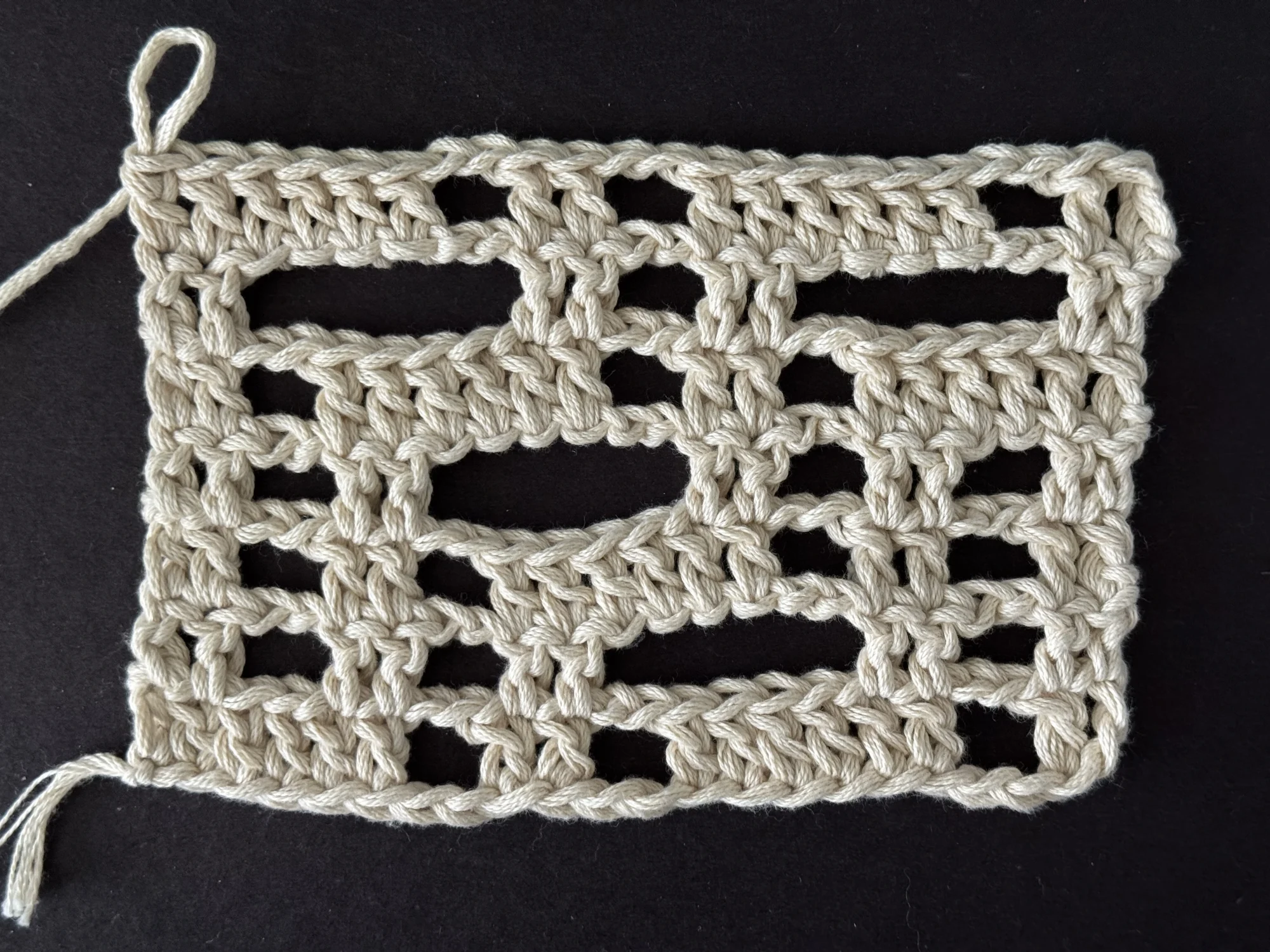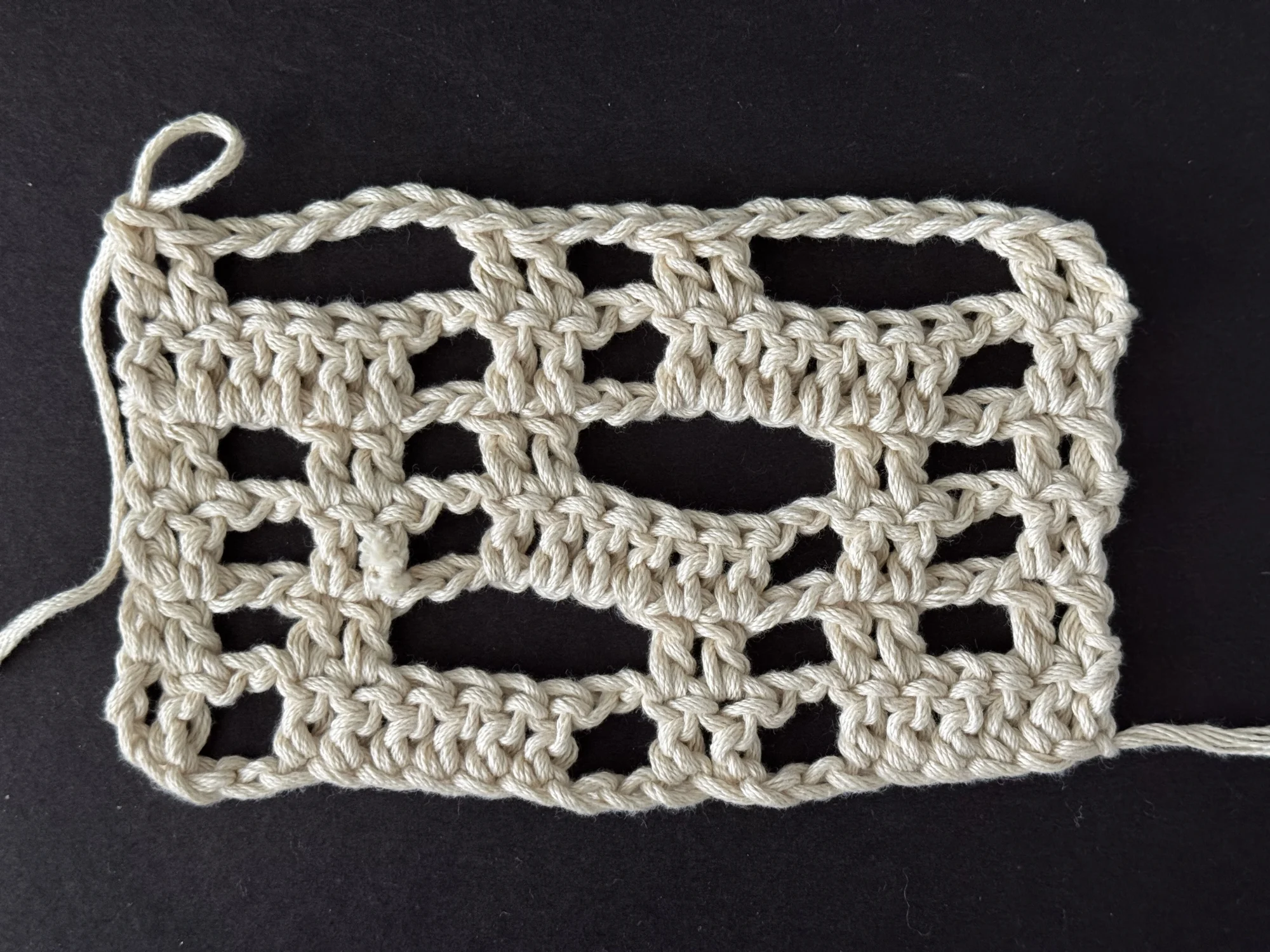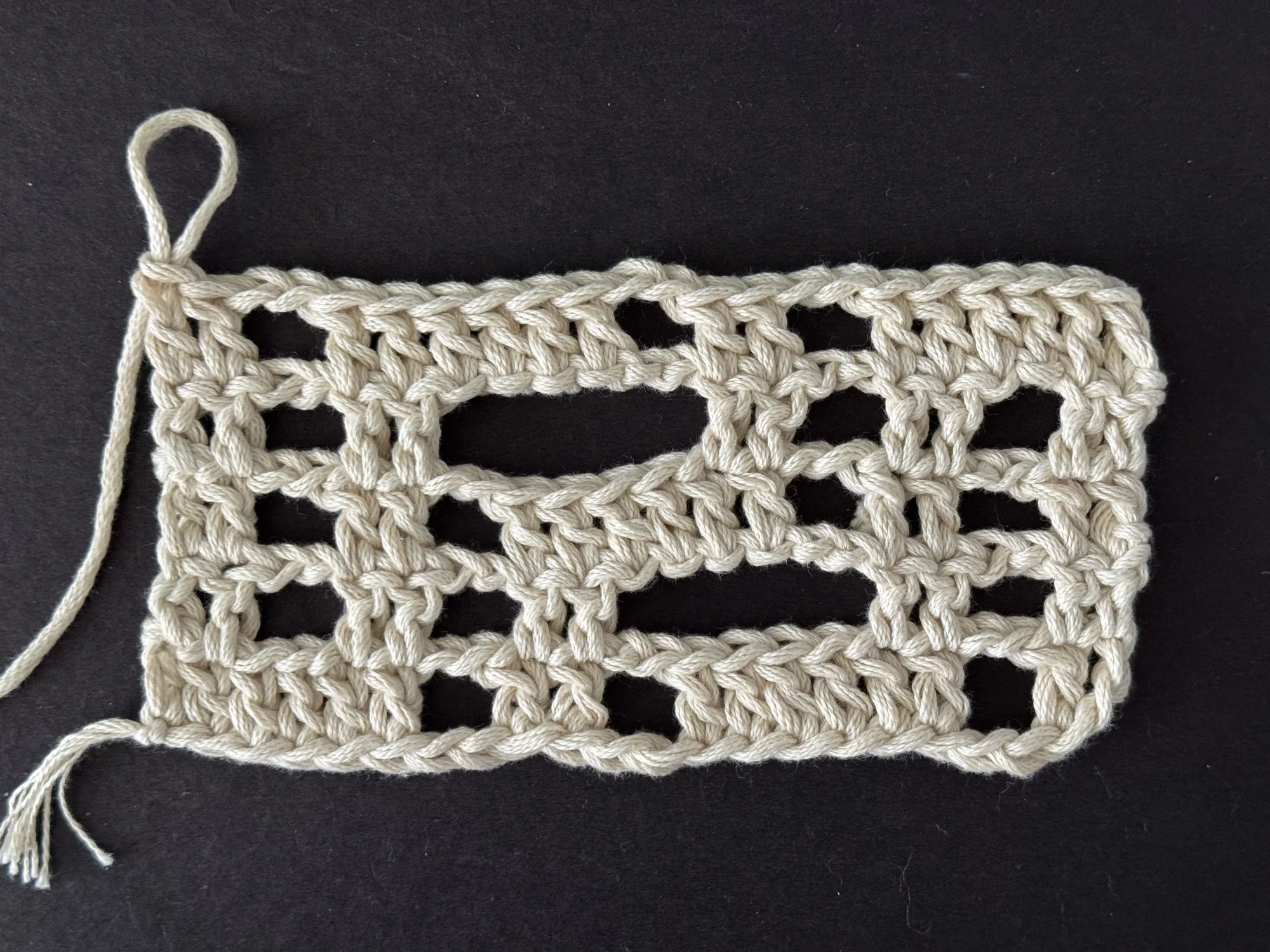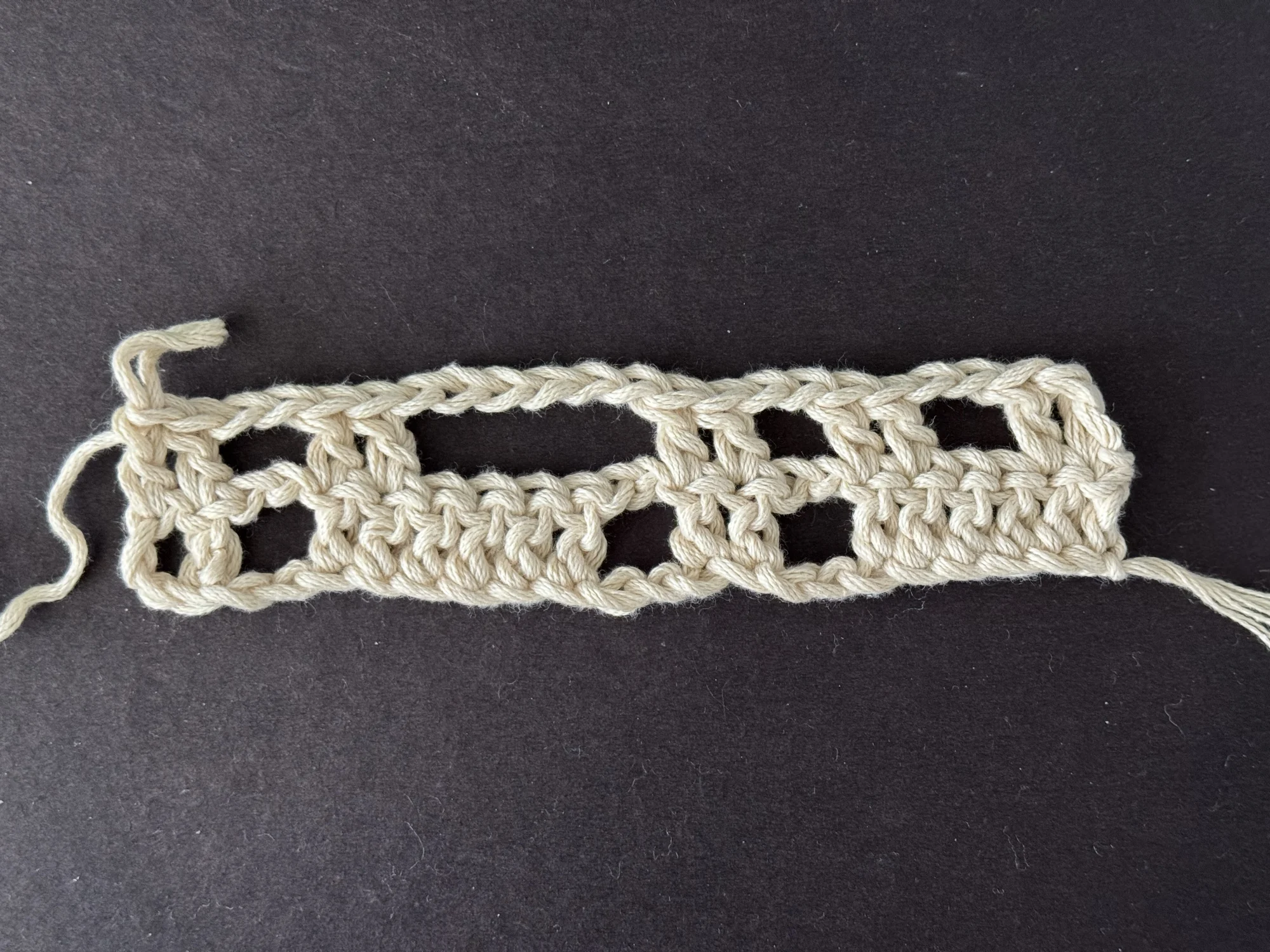 Row 4: CSDC in first st, dc in next st, ch 2, sk 2 sts, dc in next 2 sts, *ch 6, sk 6 st, dc in next 2 sts, ch 2, sk 2 sts, dc in next 2 sts, repeat from * until 4 sts remain, ch 2, sk 2 sts, dc in last 2 sts, turn.