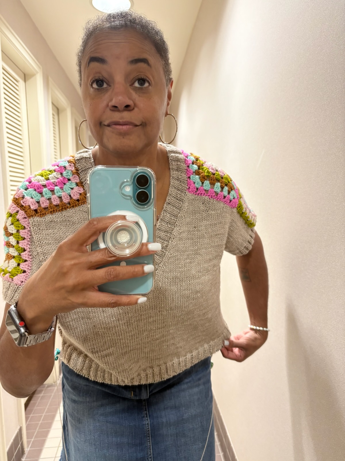 I set the first attempt aside and scrolled through the gorgeous knit and crochet projects Channy has finished and shared to her IG page, which landed me on the Geddy Tee. This fantastic pattern is a knit top with granny squares placed at the shoulder and sleeves. I knew that I needed to include the granny stitch with a baseball cap, as there are enough beanie or bucket hat patterns made from multiple granny squares.
